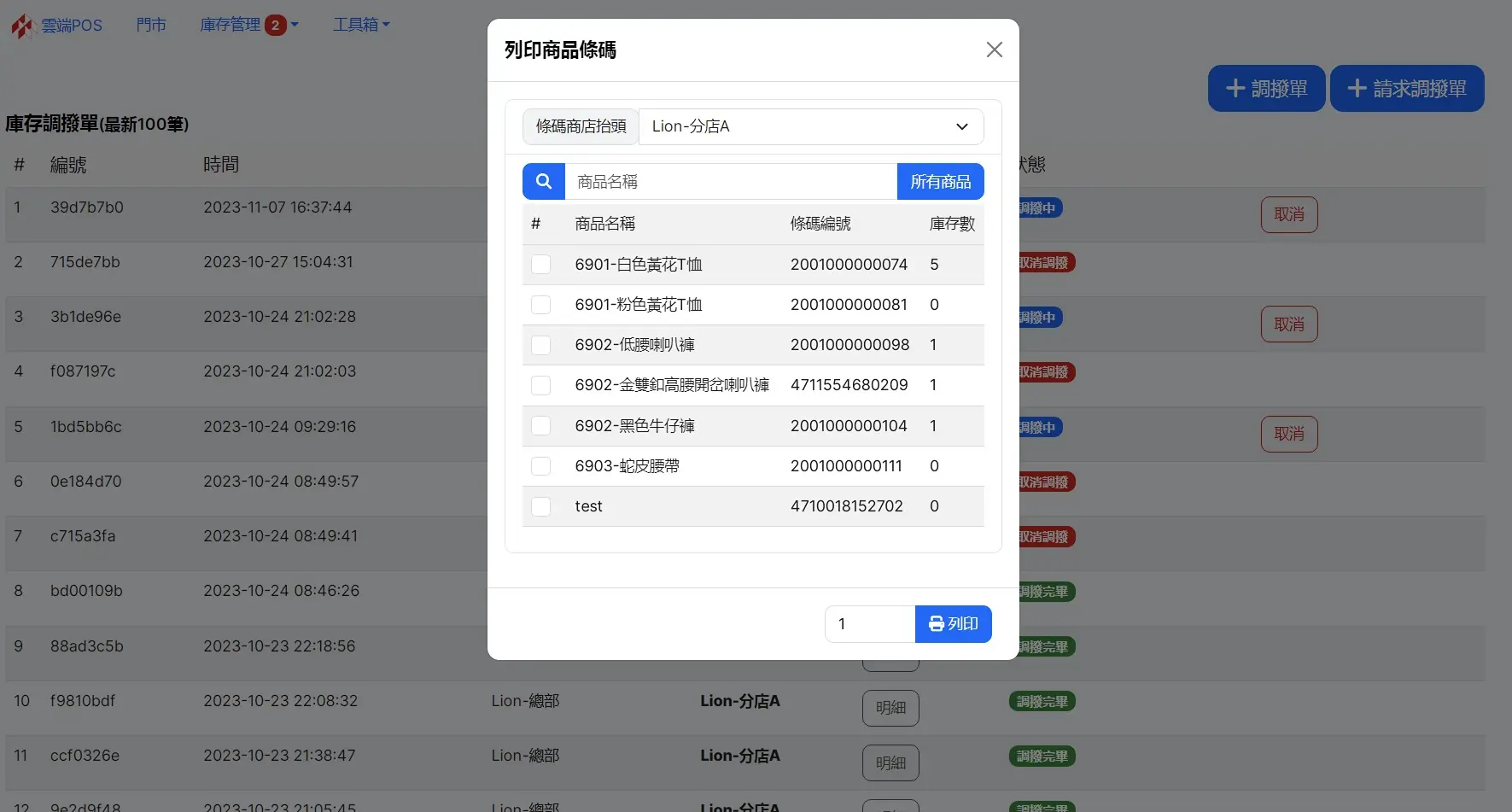 可列印商品條碼,勾選多筆商品輸入張數列印條碼。